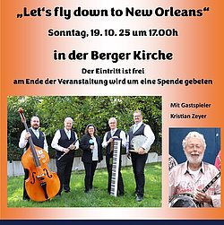 Das letzte Konzert der diesjährigen Konzertreihe am Sonntag, den 19.10.2025 um 17:00 Uhr in der Berger Kirche wird von den Offheimer Jazzbären und dem Gastmusiker Kristian Zeyer gestaltet. Unter dem Motto „Let’s fly down to New Orleans“ werden Jazztitel zu hören sein, die alle einen Bezug zu New Orleans haben.
