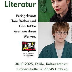 LIMBURG | Literatur, die berührt - Texte, die nachhallen - Begegnungen, die im Gedächtnis bleiben: das erwartet Kultur- und Literaturinteressierte in Limburg. Die Gewinnerin und der Gewinner des SCIVIAS-Literaturpreises kommen nach Limburg. Am Donnerstag, 30. Oktober 2025 um 19 Uhr präsentieren sie ihre preisgekrönten Texte im Kulturzentrum (Grabenstraße 37, 65549 Limburg).