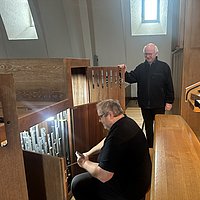Katholisches Limburg Orgelpflege in St. Marien Kirchenmusik Marcel May Orgelbauer Michael Müller (Osterspay) und Frank Sittel, Organist in der Limburger Pallottinerkirche, während der Durchsicht und Ü