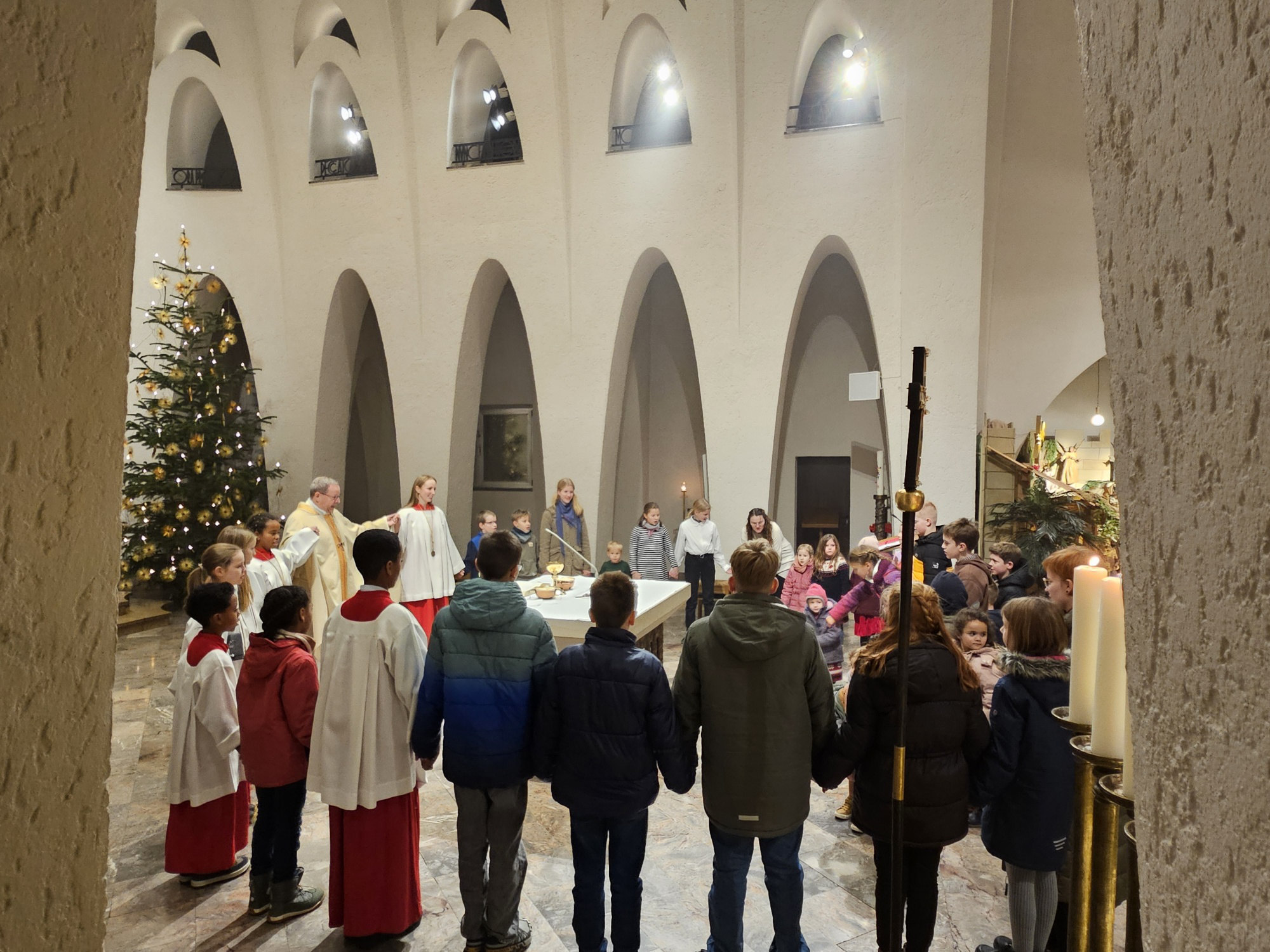 Zum Vater unser waren dann alle anwesenden Kinder eingeladen, sich gemeinsam mit dem Bischof um den Altar als Tisch des Herrn zu versammeln und das Gebet zu sprechen, dass Jesus selbst uns geschenkt hat. Nach dem Friedensgruß sandte der Bischof die Kinder dann in die ganze Kirche, um allen anwesenden Gläubigen den weihnachtlichen Frieden zu wünschen. Die Kinder kamen diesem Wunsch des Bischofs gerne nach und verteilten den Friedensgruß bis zur letzten vollbesetzten Reihe in der Pallottinerkirche.