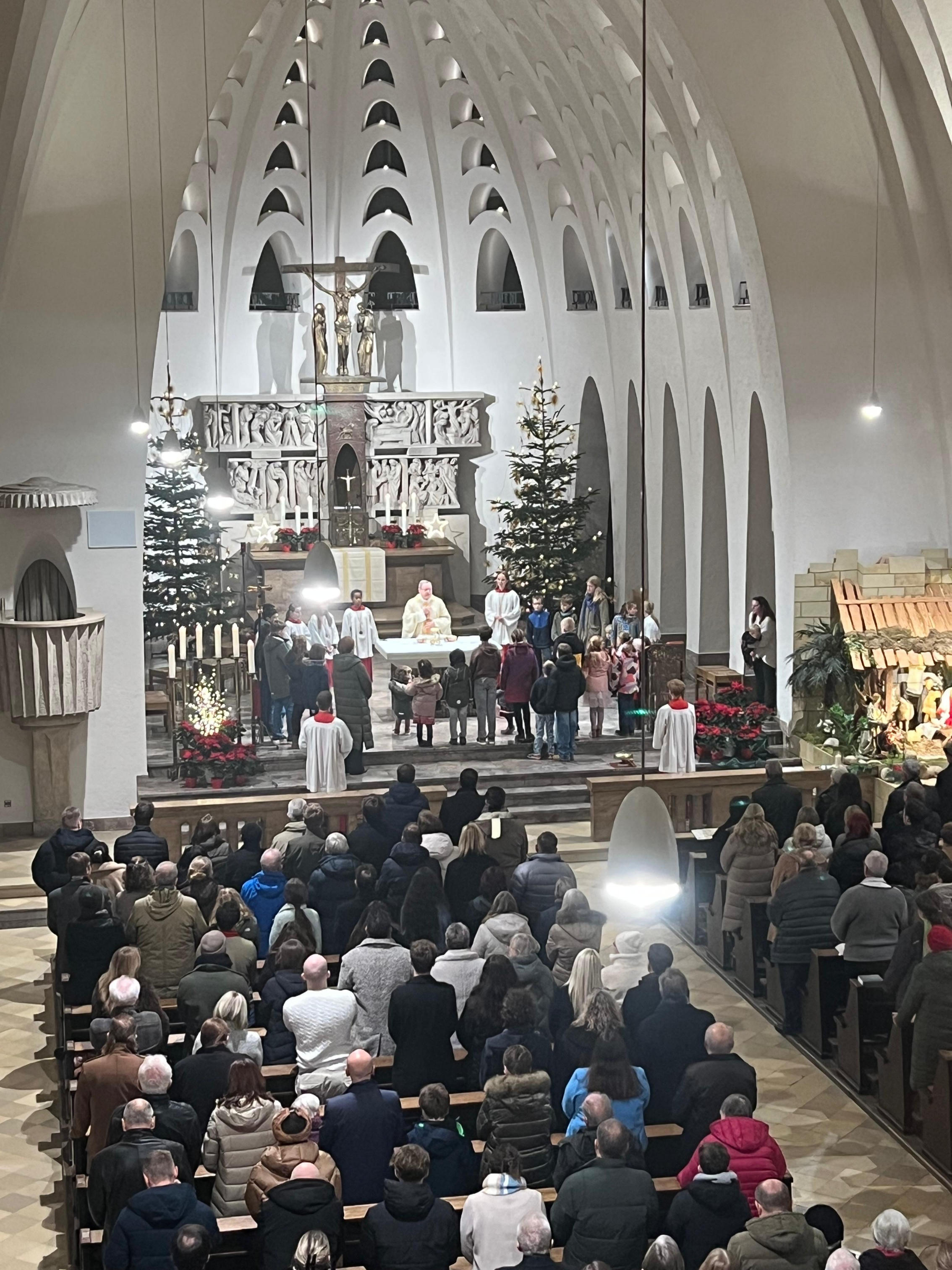 So beginnt das Weihnachtsfest besonders für Familien mit Kindern mit einer Messe. Der Gottesdienst begann traditionell mit dem Martyrologium, der gesungenen Festankündigung durch Leonhard Höhler als Kantor und Organist: „Die Geburt unseres Herrn Jesus Christus im Fleische“ wird angekündigt und mit der Menschheits- und Heilsgeschichte in einen Zusammenhang gestellt.